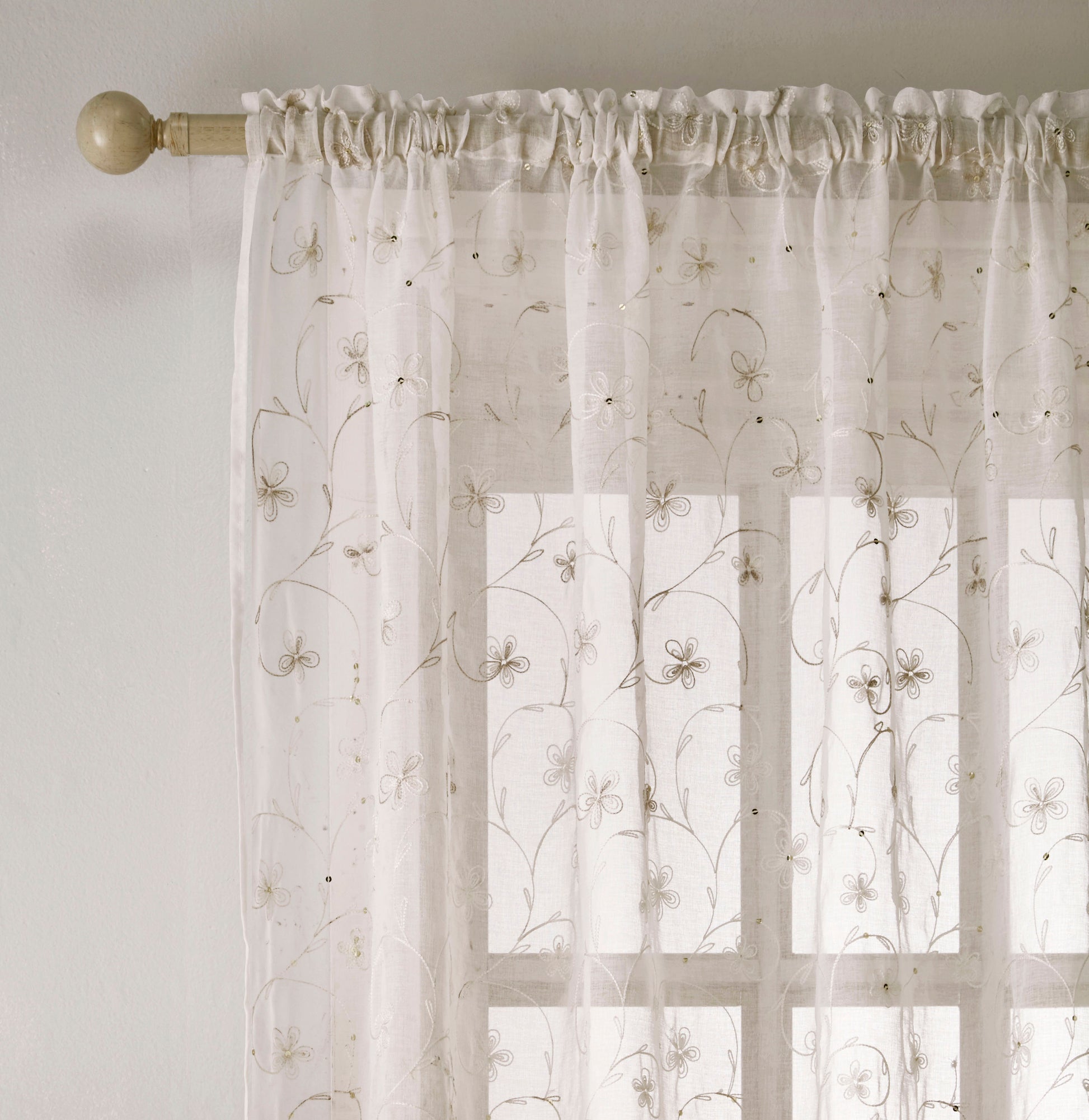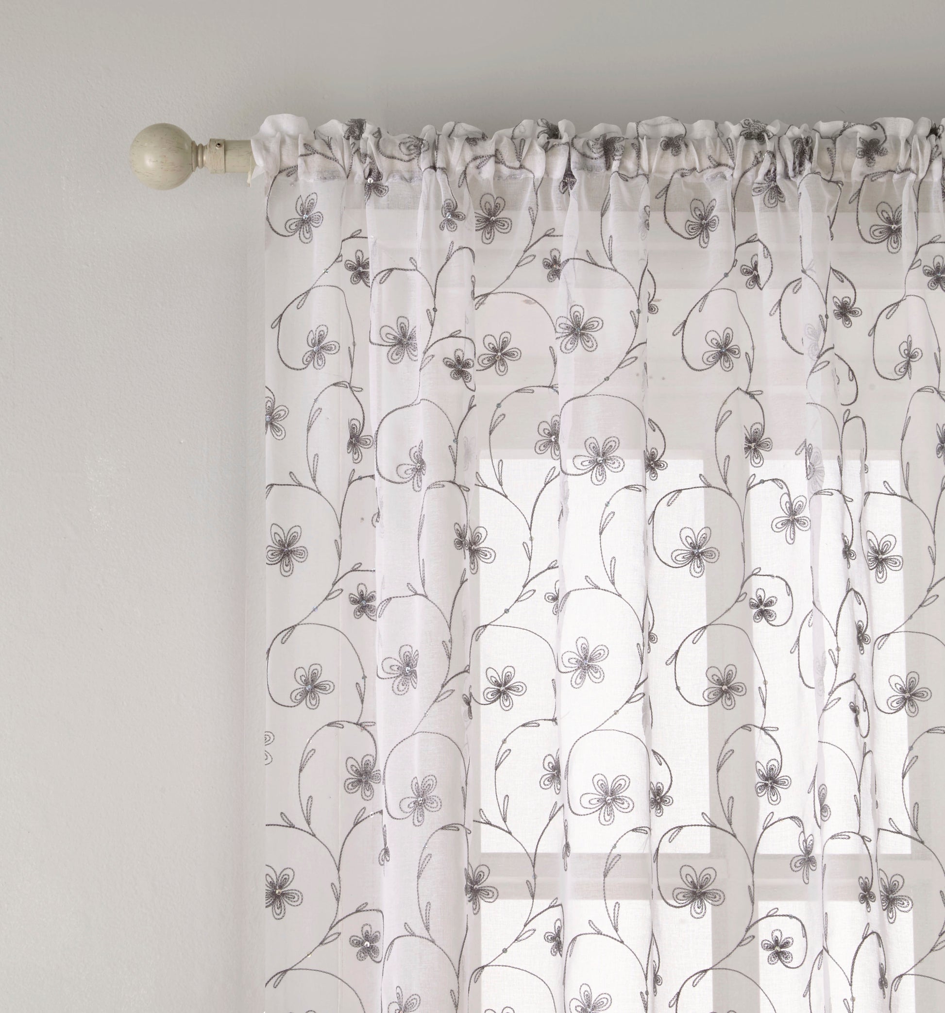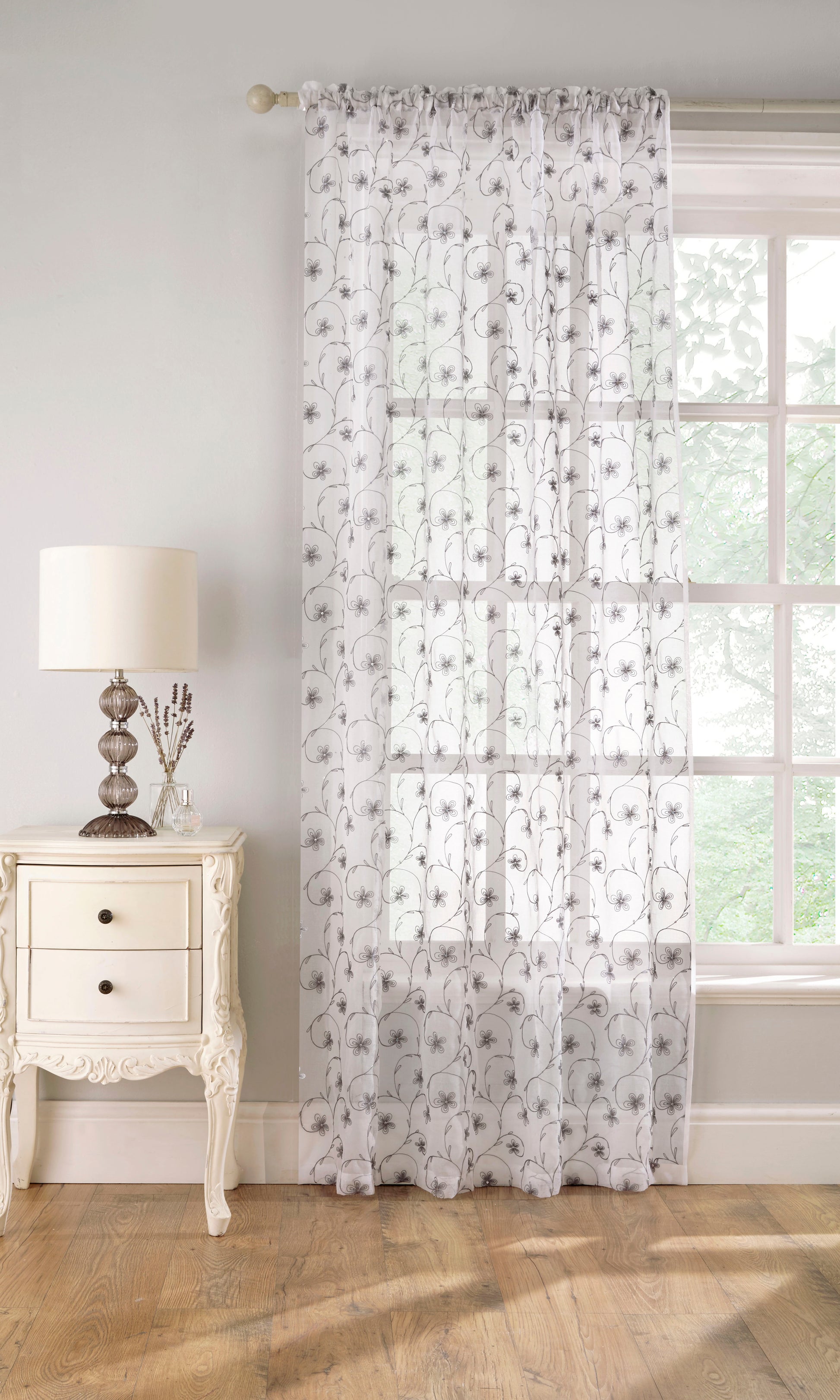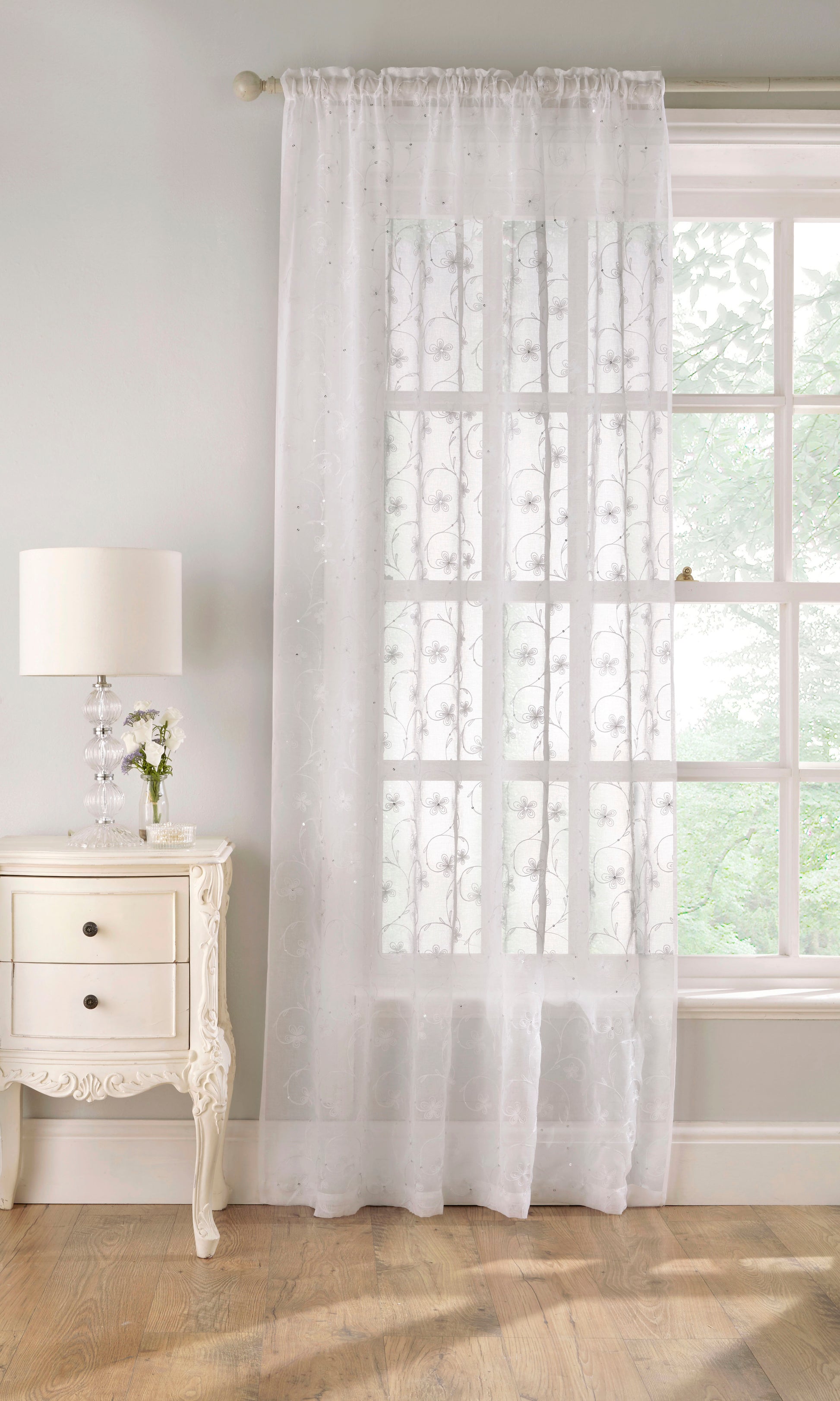 The Belle Voile Panel exudes elegance with its delicate embroidered floral design and coordinating sequins, making it perfect for adding a touch of sophistication to any room. The intricate detailing combined with a linen-look fabric creates a luxurious yet understated appearance. With a classic rod pocket header, it’s easy to hang and is ideal for enhancing the beauty of living spaces or bedrooms.