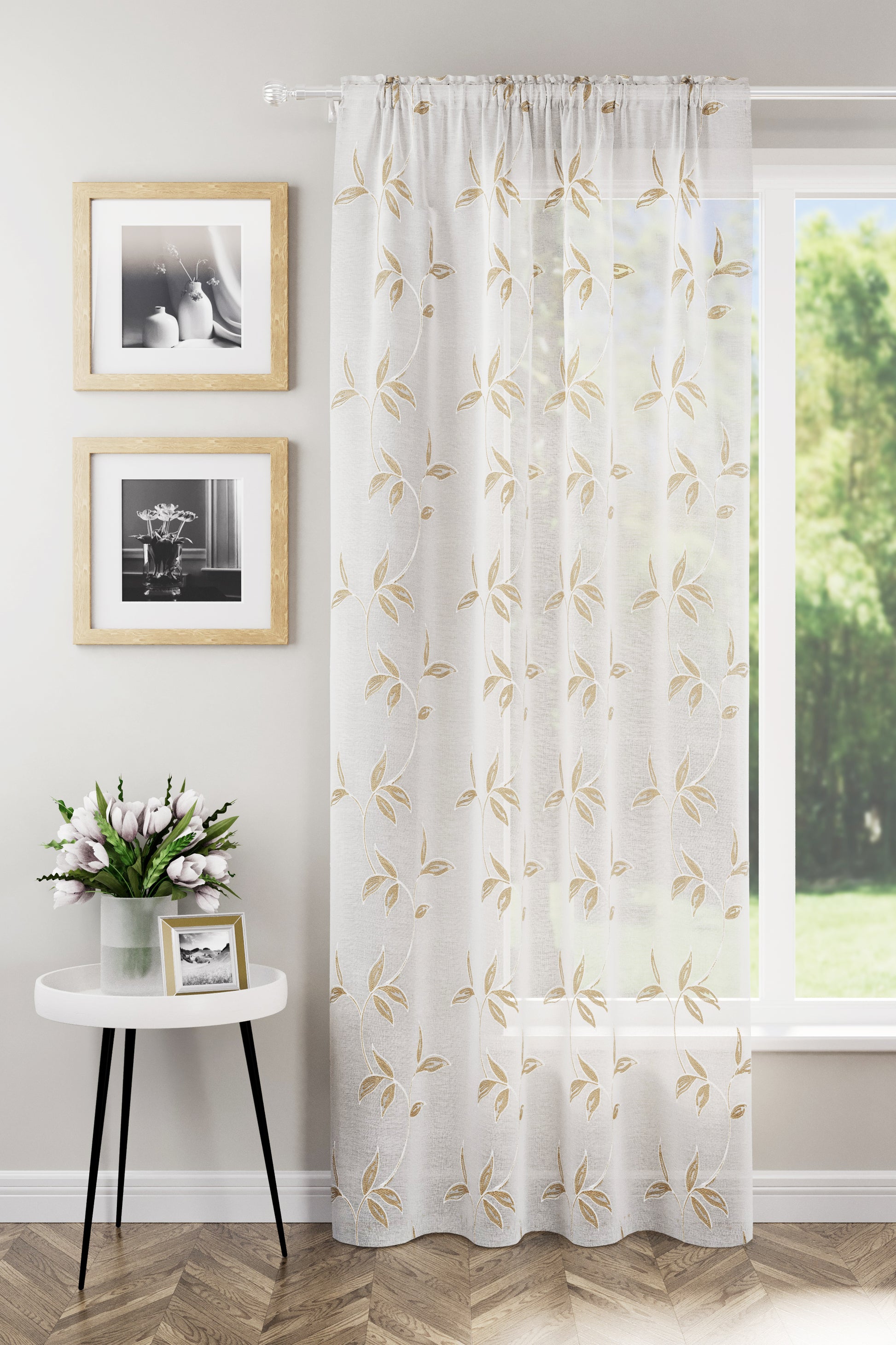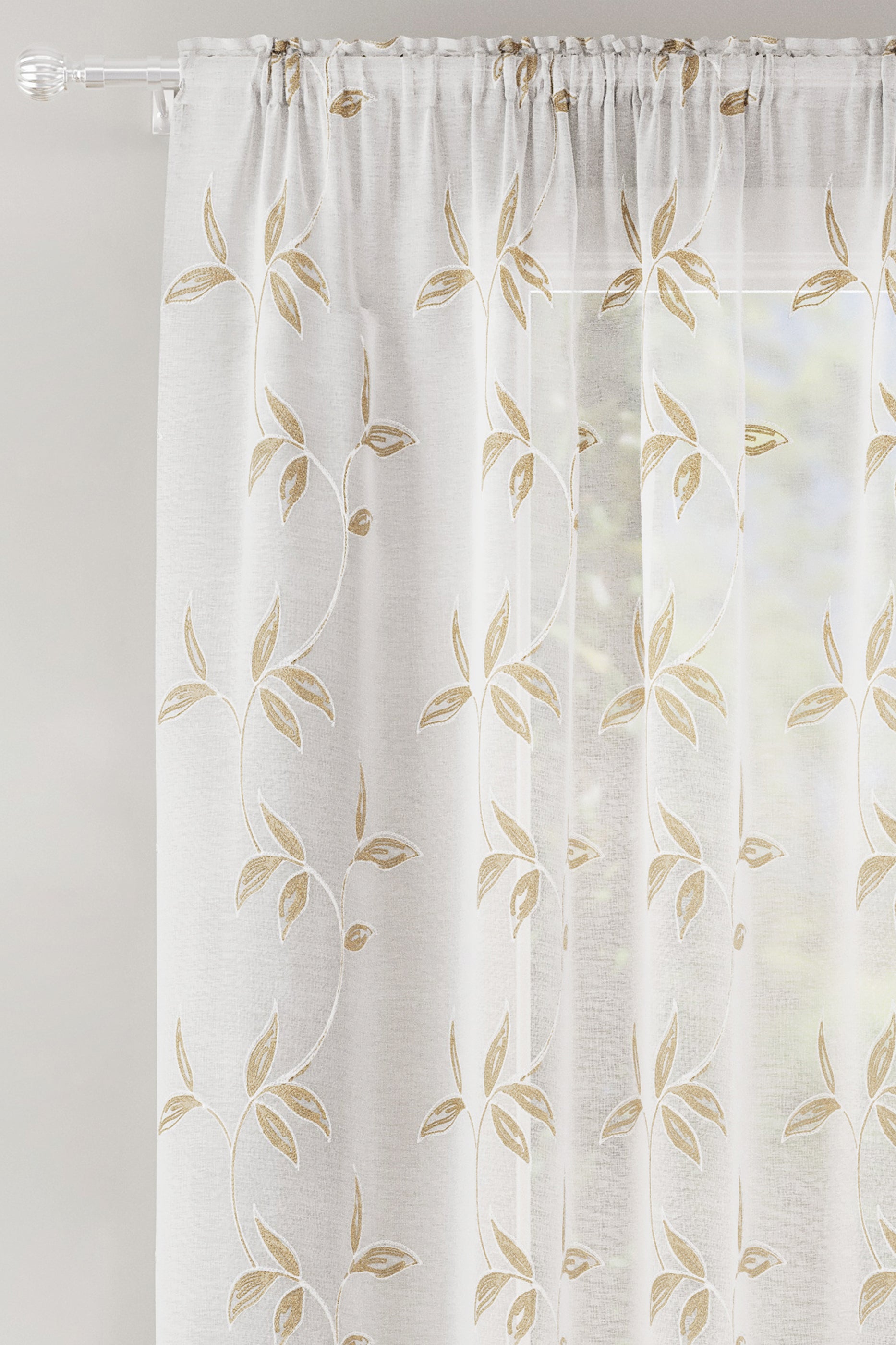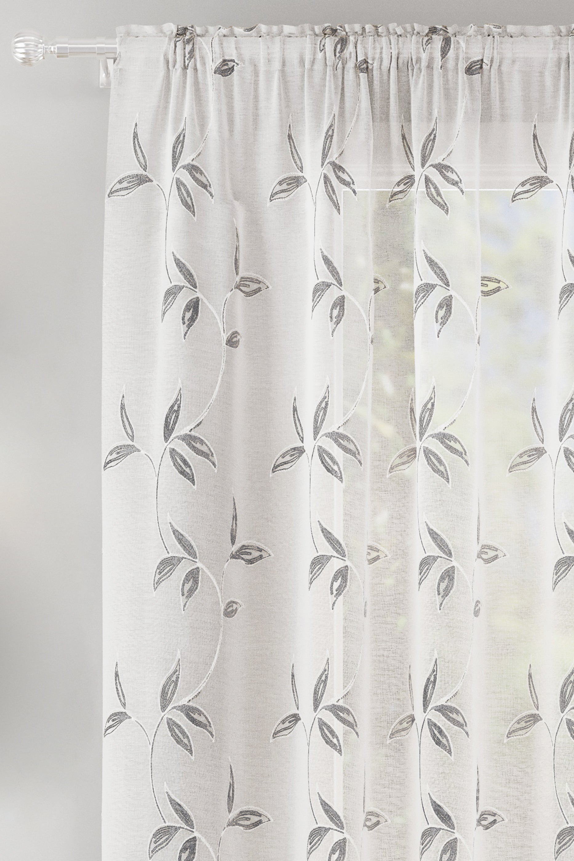 The Oasis Leaf Design Voile Panel features a beautiful all-over embroidered leaf pattern that adds a natural and delicate touch to any room. The sheer fabric gently filters light while maintaining privacy, making it ideal for living spaces or bedrooms. Its rod pocket header ensures easy installation and a neat finish, enhancing the elegance of your windows.
