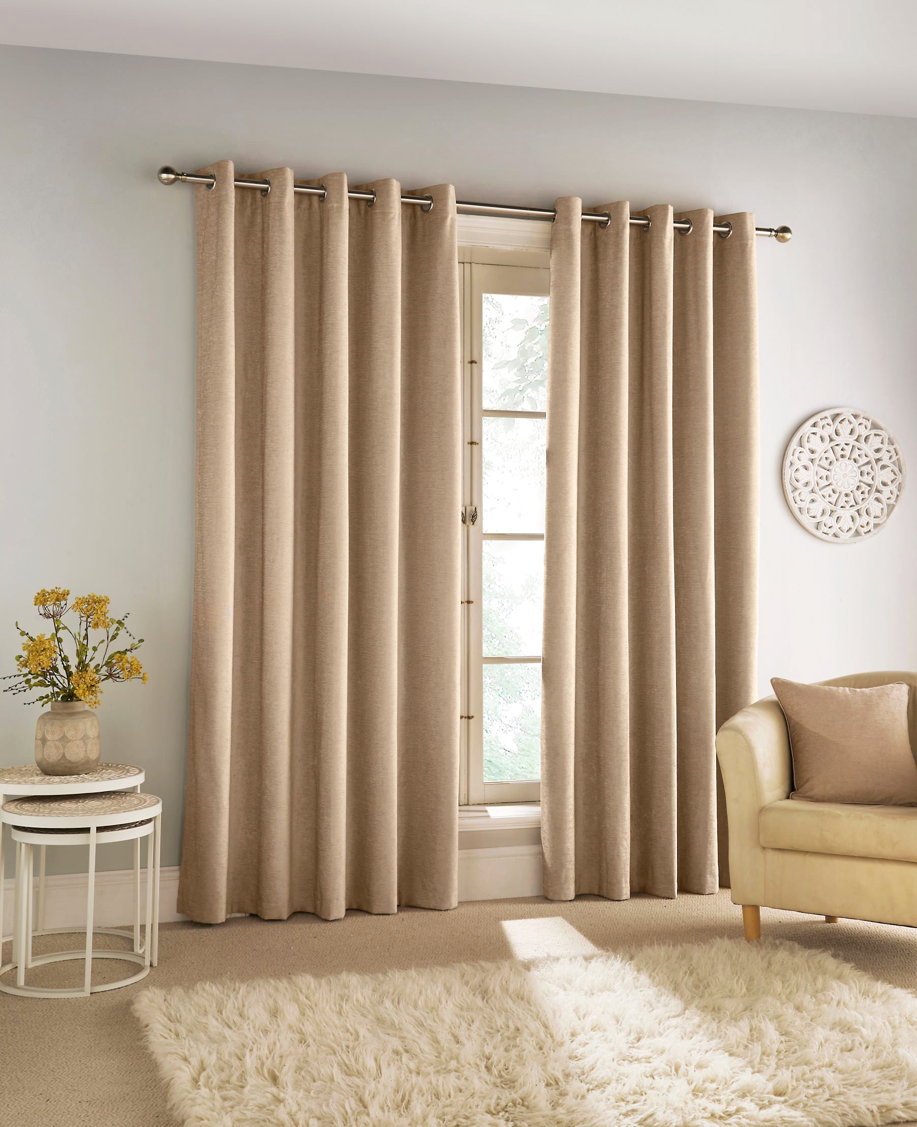 The Savoy Readymade Curtain is crafted from a luxurious chenille fabric that exudes elegance and sophistication. Featuring full blackout properties, it effectively blocks out light, reduces noise, and provides thermal insulation, making it perfect for both privacy and comfort. With a sleek eyelet header, it’s easy to hang and suits various room styles, adding a refined touch to any space.