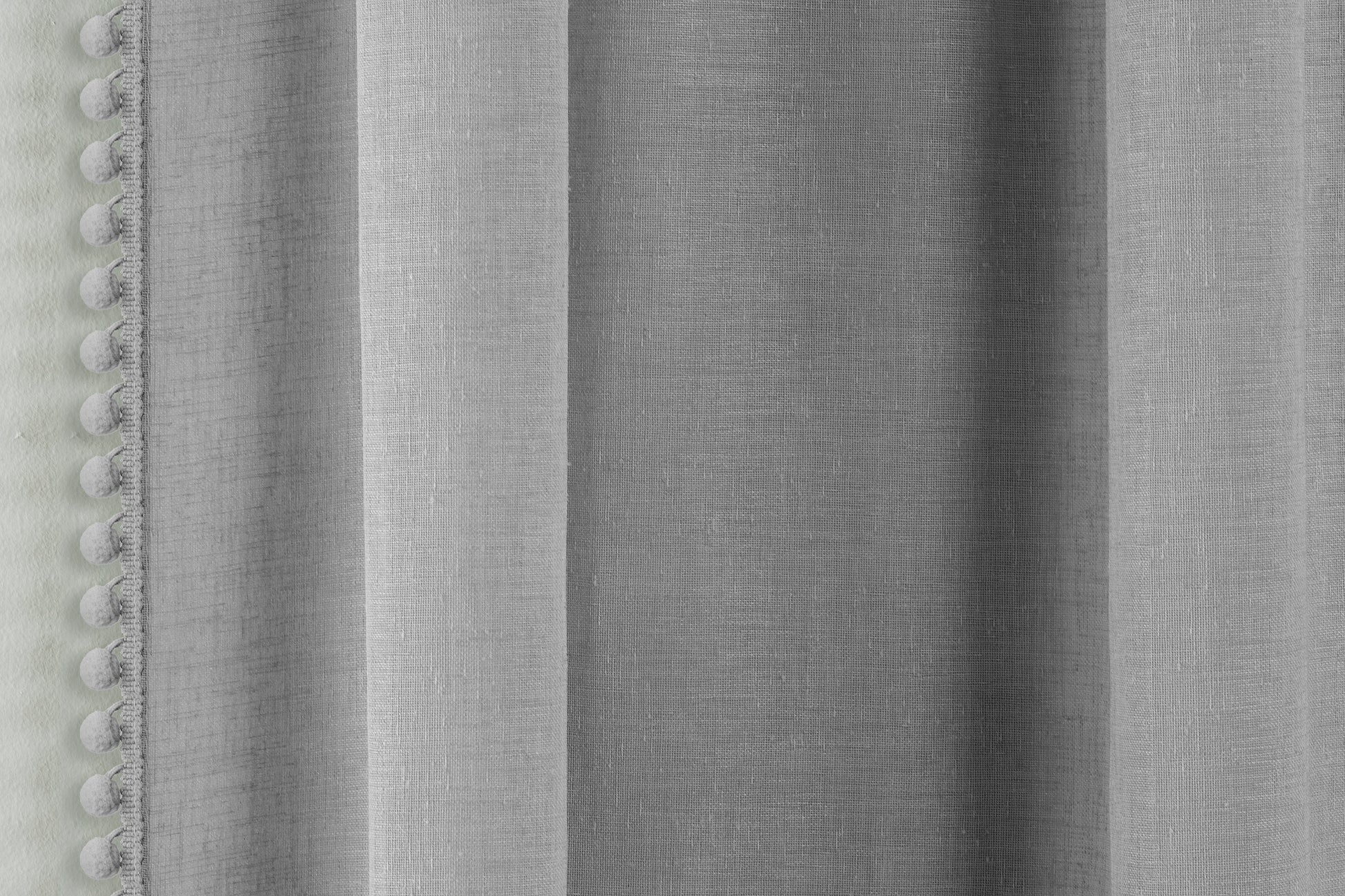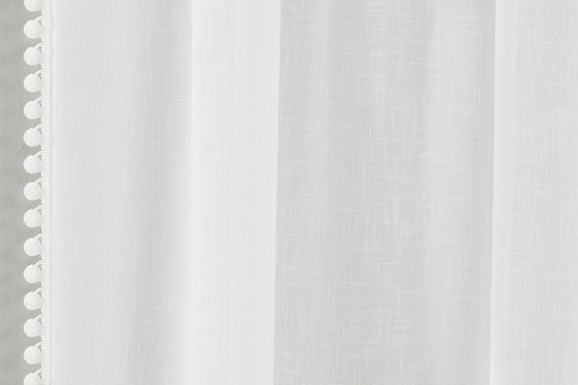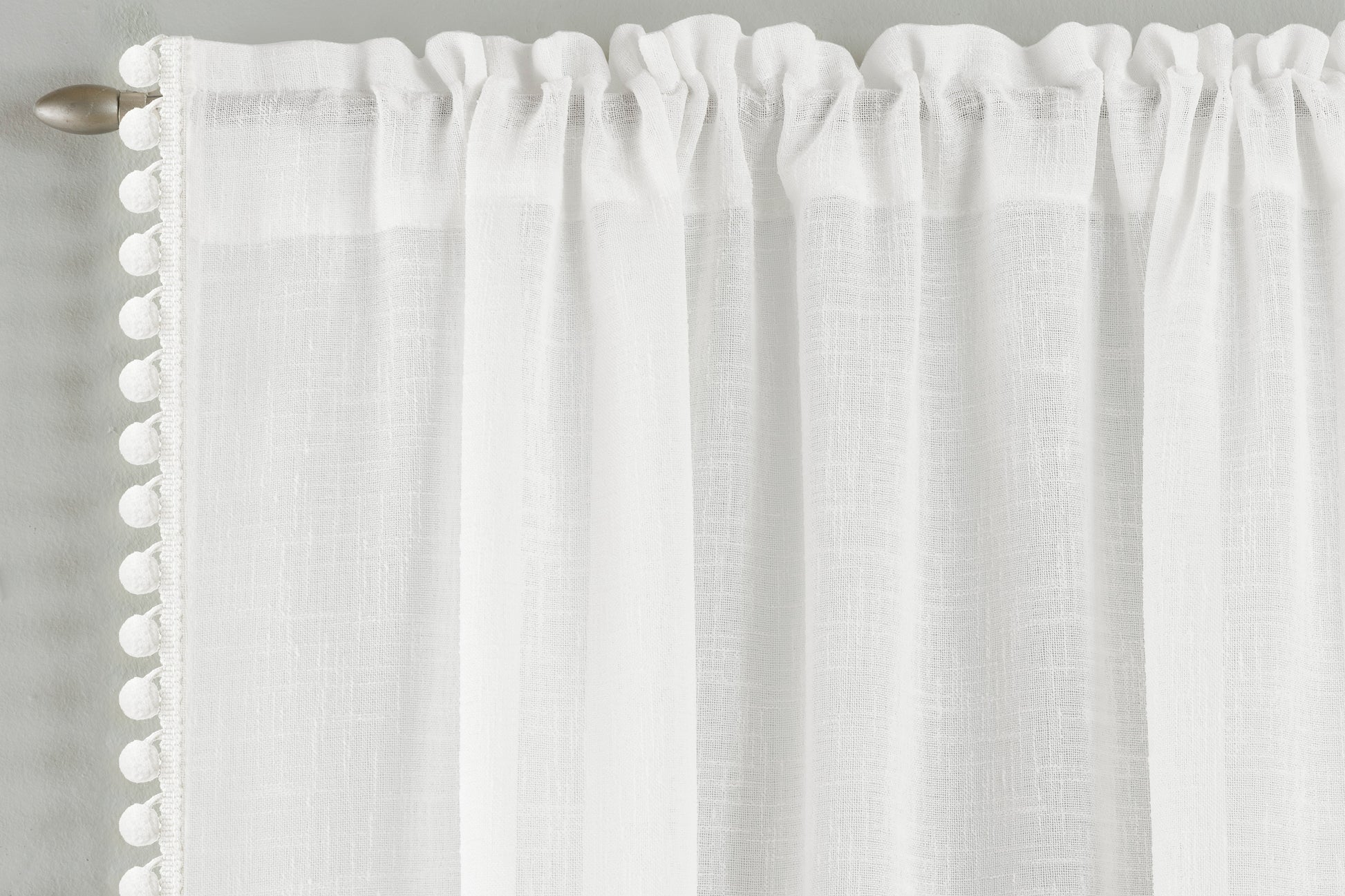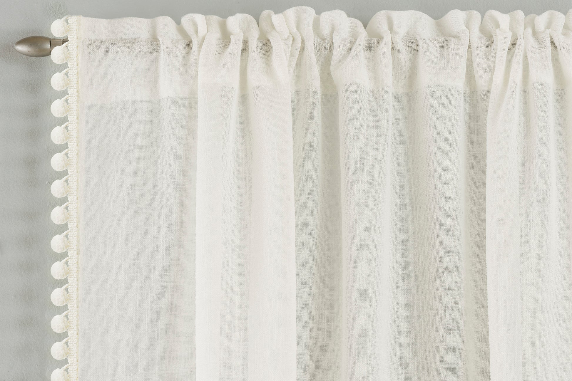 The Tahiti Voile Panel adds a playful and stylish touch with its delicate pom-pom trim on a soft linen-look fabric. This panel allows light to filter through gently while maintaining privacy, making it ideal for living rooms or bedrooms. Its rod pocket header ensures easy installation and a neat, gathered finish, enhancing the overall look of your decor.